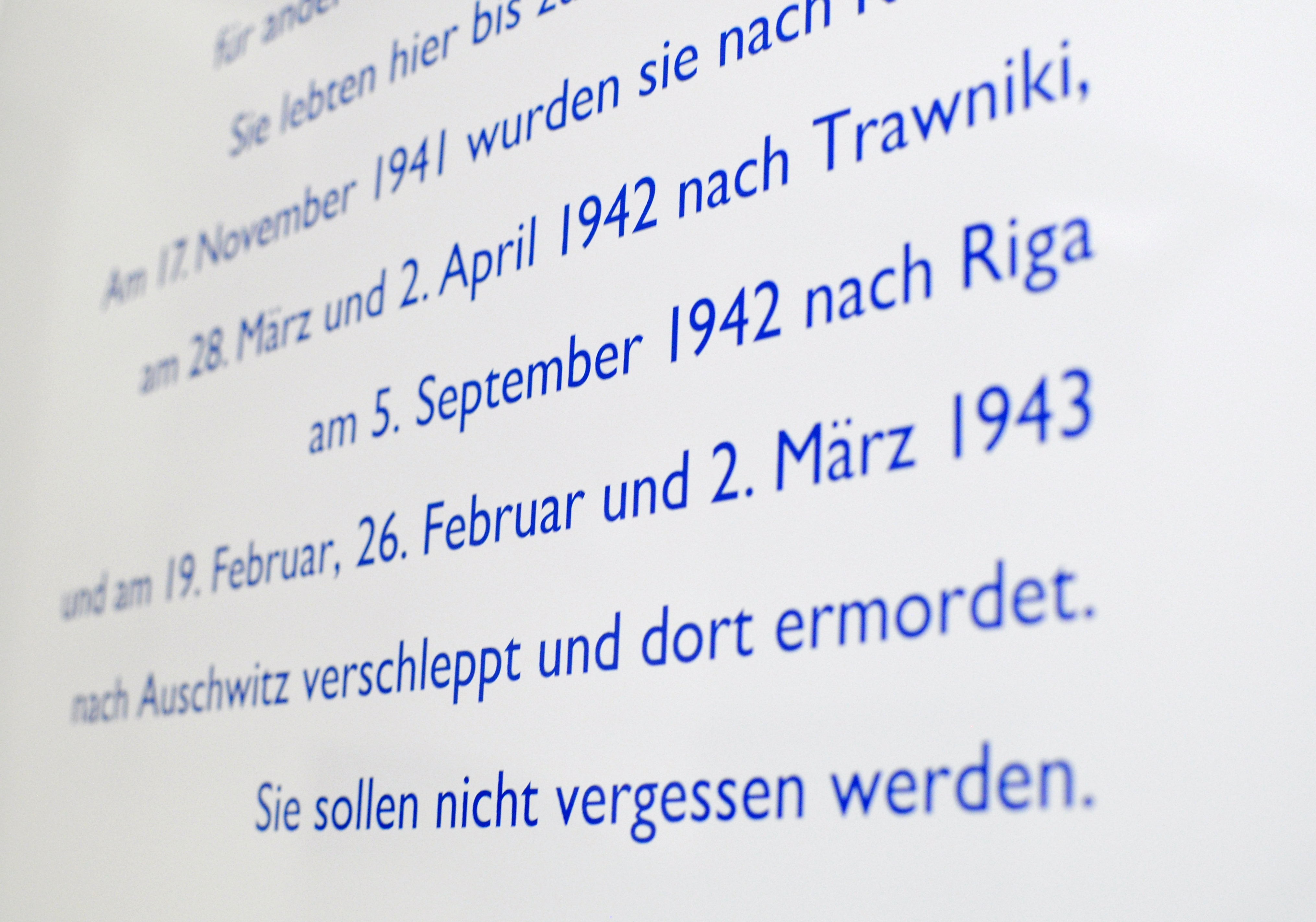 22 jüdische Menschen sind aus unserem Haus zwischen 1941 und 1943 deportiert worden. Zur Erinnerung an sie haben wir die Tafel mit ihren Namen in unserem Hauseingang angebracht.