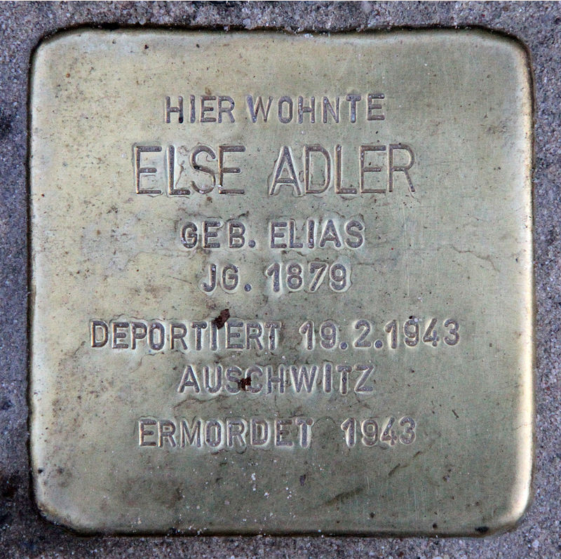 In der Wichmannstraße in Berlin-Tiergarten gibt es einen Stolperstein für Else Adler. Ihre beiden Enkel Shmuel und Reuven Merhav haben anlässlich der Verlegung dieses Stolpersteins eine berührende Rede gehalten, die HIER nachgelesen werden kann.