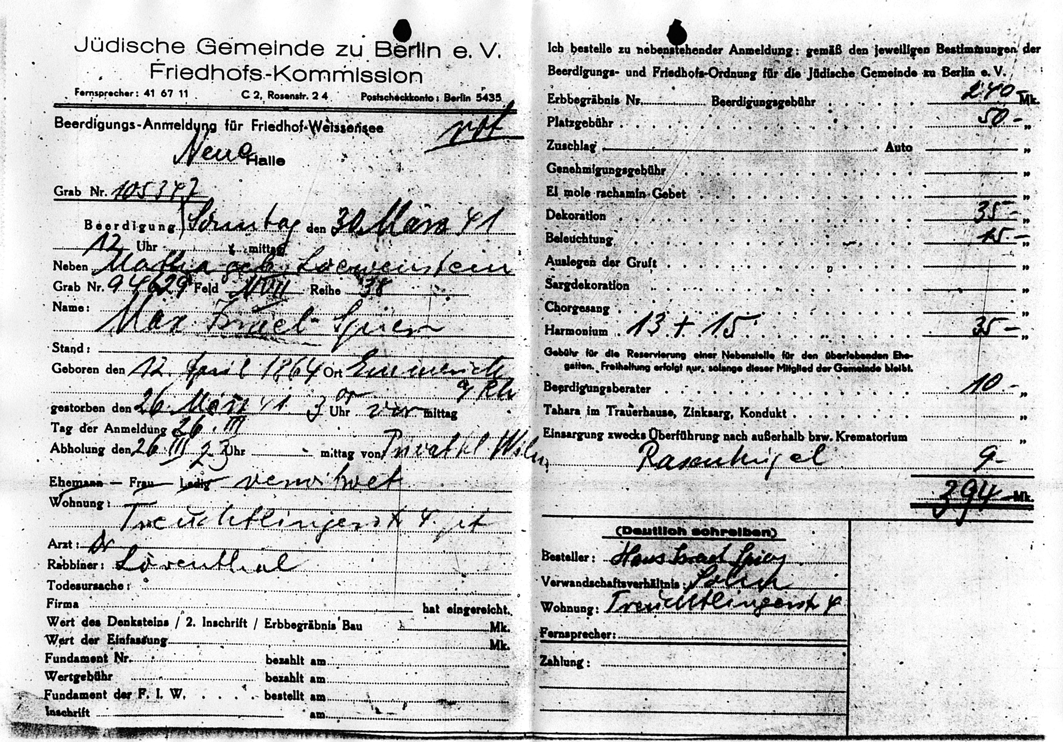 Quelle: Archiv des Jüdischhen Friedhofs Berlin-Weißensee
