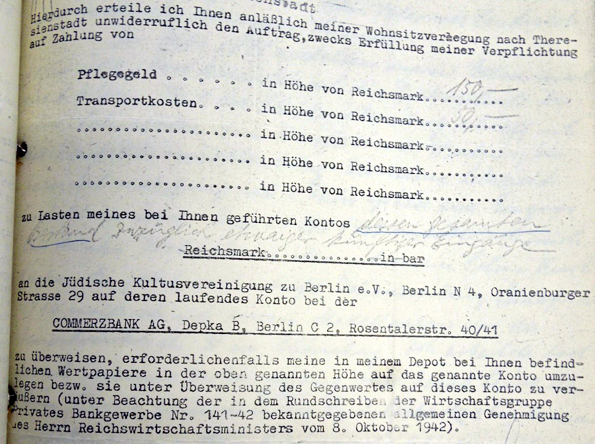 Nach der Scheidung wohnten Siegfried und seine Mutter in einer gemeinsamen Wohnung und Jacob bezog ein möbliertes Zimmer in der Apostel-Paulus-Straße 18. Von dort ist er wahrscheinlich in die Treuchtlinger Straße 4 gezogen, wo er beim Ehepaar Spier im Parterre wiederum in einem möblierten Zimmer unterkam. In der verpflichtend auszufüllenden Vermögenserklärung vom 15. Februar 1943 vermerkt Jacob Leibholz, dass er für dieses Zimmer eine monatliche Untermiete von 54 Reichsmark zahlt und zu diesem Zeitpunkt lediglich „einige Stücke“ Wäsche und Herrenbekleidung sowie ein Paar Schuhe besitzt. Unter der Rubrik „Höhe des jetzigen Gesamtvermögens (nach Abzug der Passiven)“ notiert er: „50,- Rm/ ab Pflegegeld 50,- Rm/ Summe 0“. Neun Tage später wurde ihm der Beschluss vom 1.10.42 über den Einzug seines gesamten Vermögens persönlich zugestellt. Zu diesem Zeitpunkt galt Jacob Leibholz als sogenannter „Reichsfeind“. Im April 1943, also etwa zwei Monate nach seiner Deportation, stellten die Behörden fest: „Nachlass wurde nicht vorgefunden.“