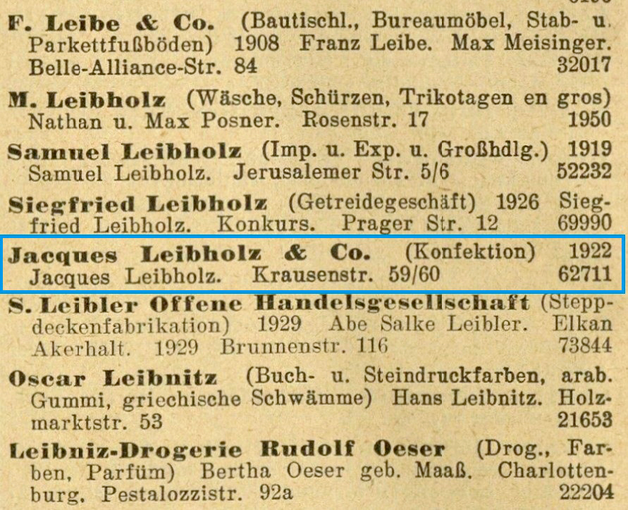 Von Jacob Leibholz sind mehrere Wohnsitze in Berlin-Schöneberg bekannt. Zur Zeit der Trauung mit Auguste lebte er laut Heiratsurkunde in der Freisinger Straße 17, und das Jüdische Adressbuch von 1931 besagt, dass die Familie damals in der Kufsteiner Straße 10 wohnte. Später zogen sie in die Meraner Straße 2, wo man laut Augustes Erinnerungen (vgl. BEG-Akte 403.366, LABO-Berlin) bis zum 1. Oktober 1939 gemeinsam als Familie lebte.